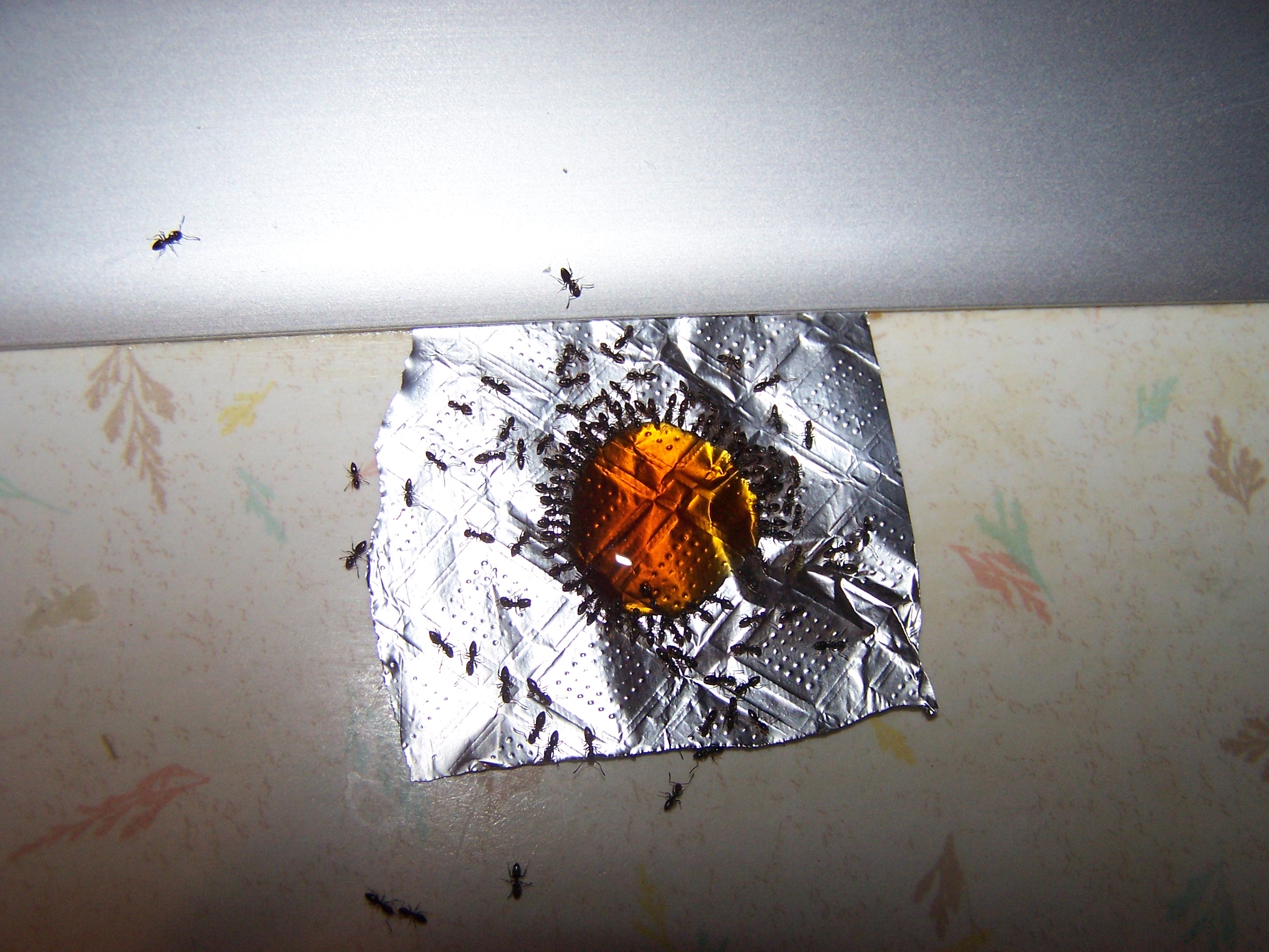 I decided it was time for full scale ant war-fare. I got out my trusted bottle of “Terro Ant Killer” and put a dap of the thick, gooey, sweet stuff on a piece of tin-foil, carefully placing it where they seemed to be having a “committee meeting”. Within minutes they were feasting and inviting fellow ants to the dessert bar.