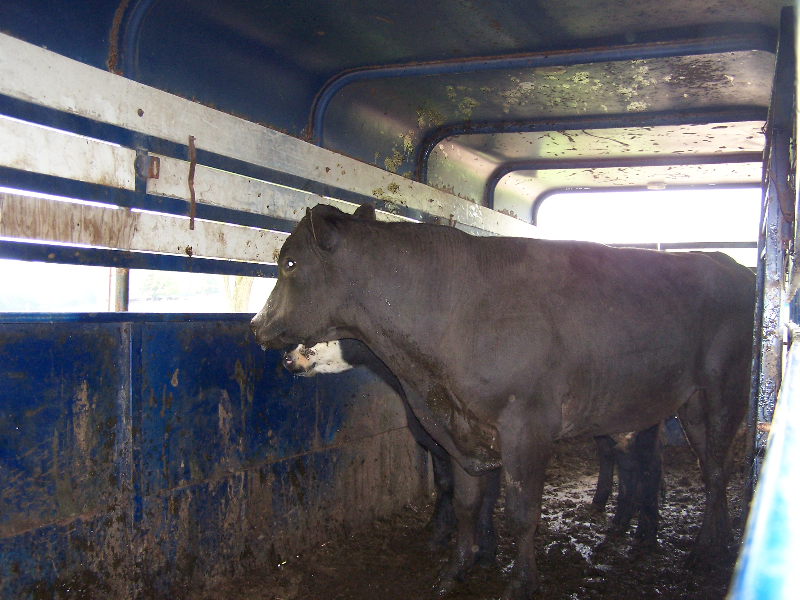The end to “my” bull (also nicknamed Fernando) finally came two weeks later. He allowed himself, in a moment of weakness, to be lured back into the sweep pen area. This time we successful loaded him on the cattle trailer along with several of his fellow herd mates. The process left me weak kneed and quivering like a bowl of jelly on the inside. I discovered this bull really does not like me and I do not like him! Maybe hate better describes his passion. The sight of me made him furious. After he was loaded I decided I needed a picture of this fearsome creature for my story. When I walked over to his prison he lowered his head and rammed the front of the gooseneck trailer so hard I was afraid it was going to come loose from the truck. It was if I was somehow to blame for his predicament. I quickly snapped a picture and fled, trembling.