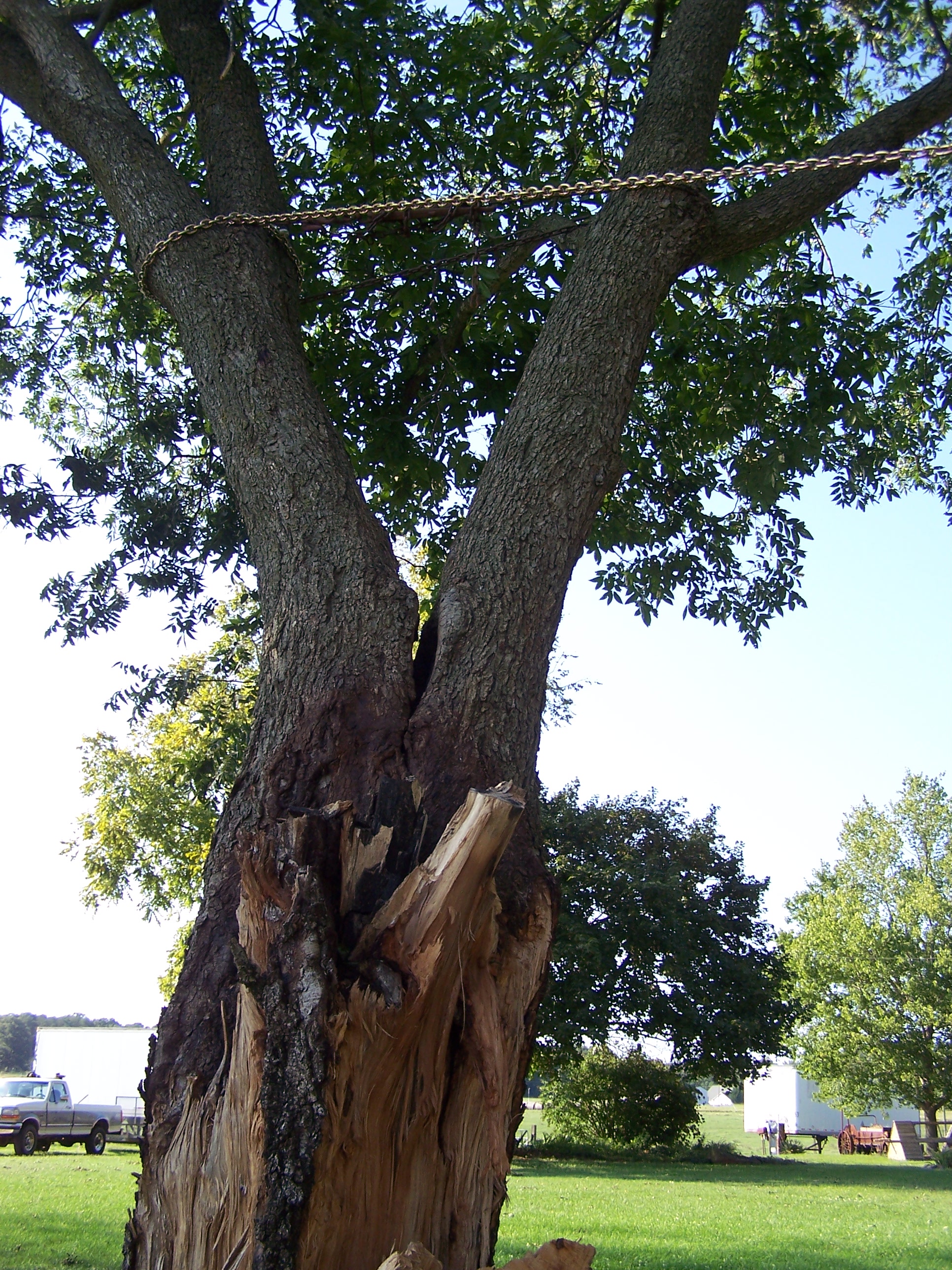This time the two remaining trunks were chained together and a “lifeline” chain was fasted well above the rotten core and firmly secured to the base of a nearby tree.