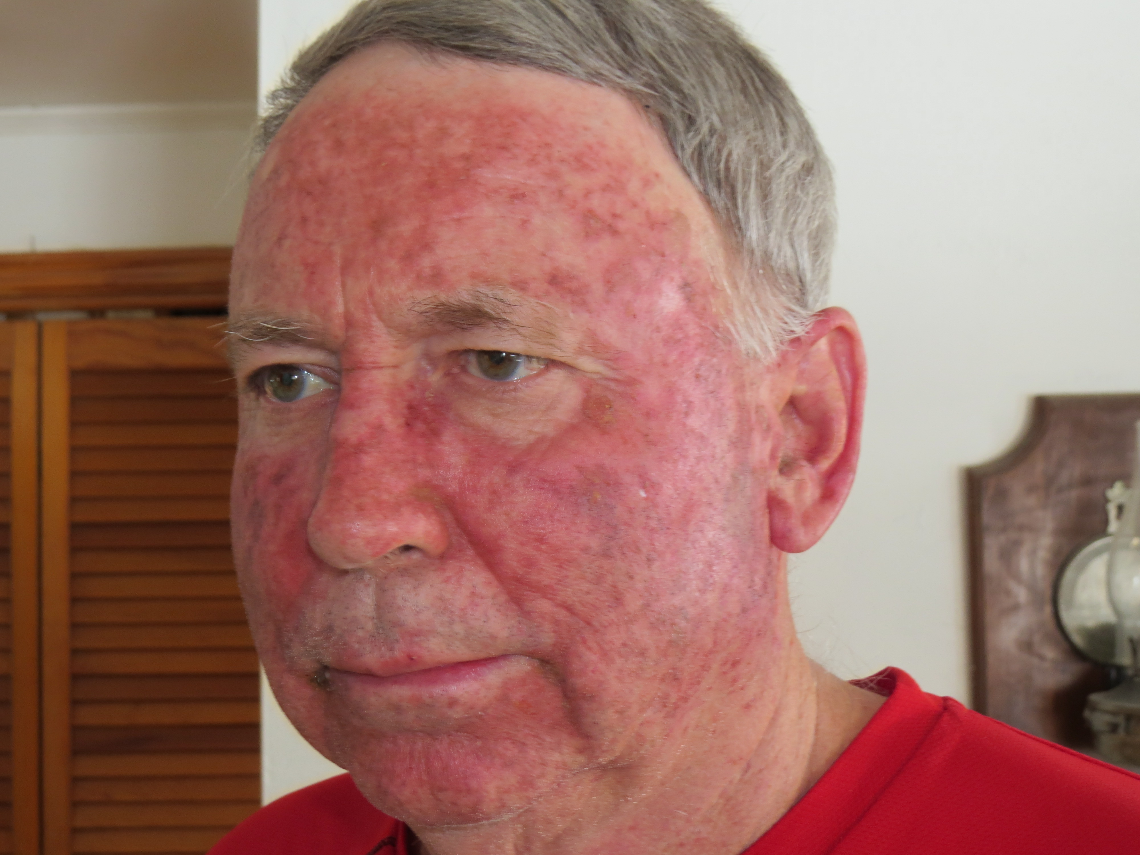 Two weeks ago he started the Fluorouracil Cream treatment. Twice a day he had to put the cream on his face and ears. This was a bigger ordeal than it first sounds. He would take a shower and shave. Then he had to wait half an hour before putting the cream on. He feels like it is taking him a long time to “primp”, especially in the mornings. It took about a week before the skin reaction started showing. Each day his face has become more blotchy and red.